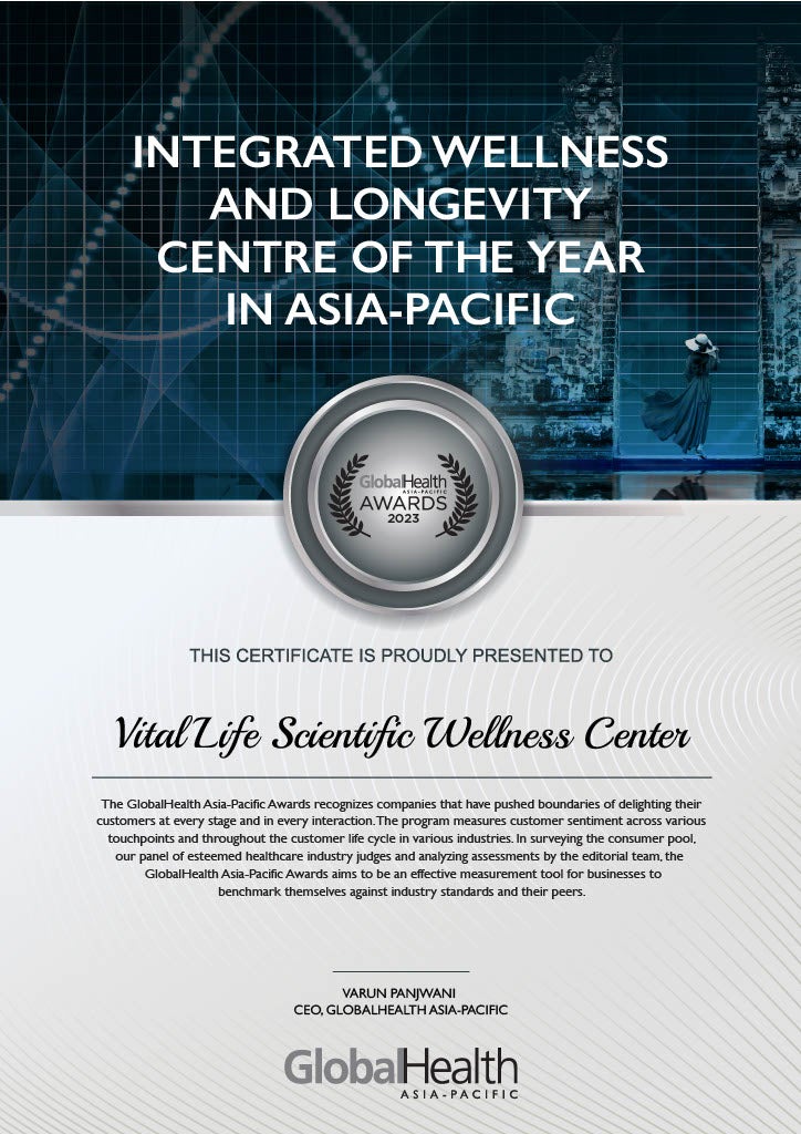 ในช่วงเวลาที่สำคัญอย่างยิ่ง ศูนย์ส่งเสริมสุขภาพไวทัลไลฟ์ ได้รับรางวัล "Integrated Wellness and Longevity Centre of the Year" ของภูมิภาคเอเชียแปซิฟิก จากงานประกาศรางวัล GlobalHealth Asia-Pacific Awards 2023 รางวัลอันทรงเกียรตินี้แสดงให้เห็นว่าถึงความมุ่งมั่น และการทุ่มเทอย่างมากของศูนย์ส่งเสริมสุขภาพไวทัลไลฟ์ในการส่งมอบการดูแลสุขภาพที่ยอดเยี่ยม และสร้างความก้าวหน้าในด้านสุขภาพแบบองค์รวม